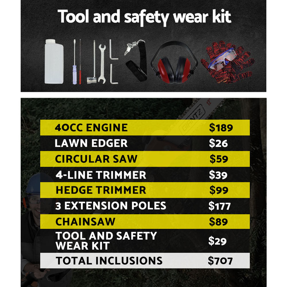 The GIANTZ Pro-series Chainsaw is the answer for people who are looking for doing serious cutting and bring it to the next level. Featuring a powerful 40cc, 4-stroke full crank engine for smoother starting and running, the chainsaw trims and cuts every gardening challenge in its path with minimum hassle. Efficient and lightweight in design and equipped with a comfortable D-handle, the chainsaw allows quick-connect coupling for easy change of attachments. In fact, up to seven attachments for every conceivable cutting job. Better still, the chainsaw also comes with three extra thick alloy extension poles which allows you to reach for those hard-to-get branches. Not least, the cutting equipment also features fine quality construction and cutting-edge technology to ensure the chainsaw remains reliable, durable and sharp consistently.