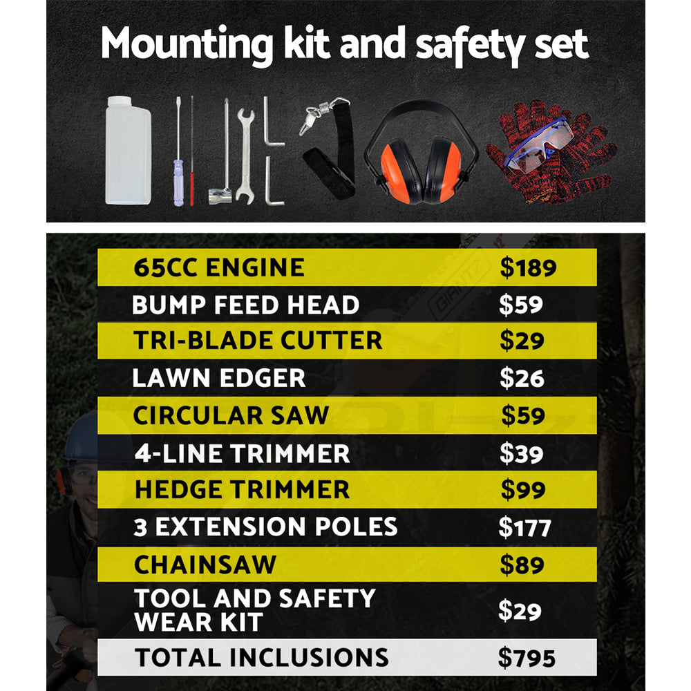 Giantz 65CC Pole Chainsaw Hedge Trimmer Brush Cutter Whipper Snipper 9-in-1 4.3m
