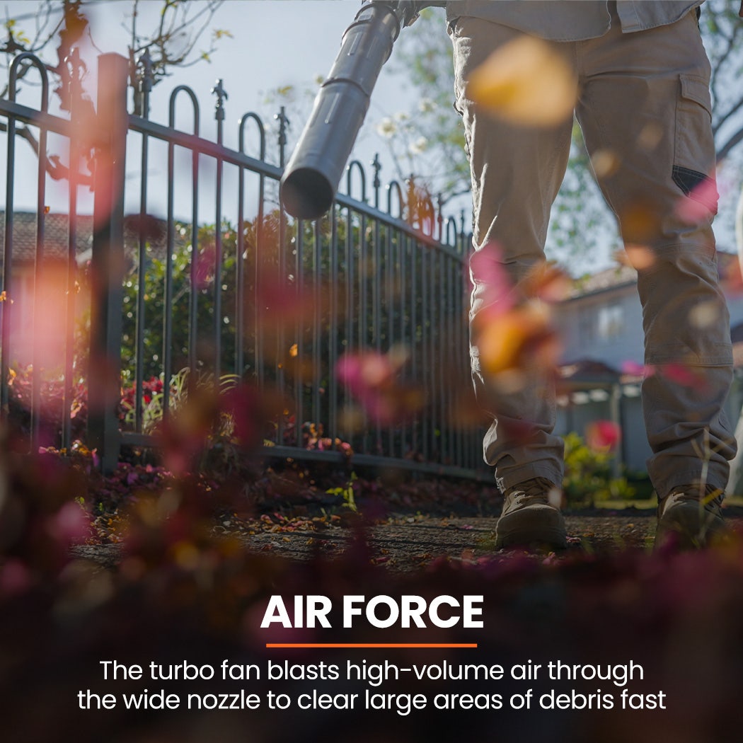 Thanks to the includedinterchangeable nozzles, you can easily clear out everywhere from driveways to garden beds, and tight crevasses. Asuper flexible air outletgives you optimal reach, and with a sensitive trigger, you can always apply just the right power to blow away even the biggest maintenance chores.